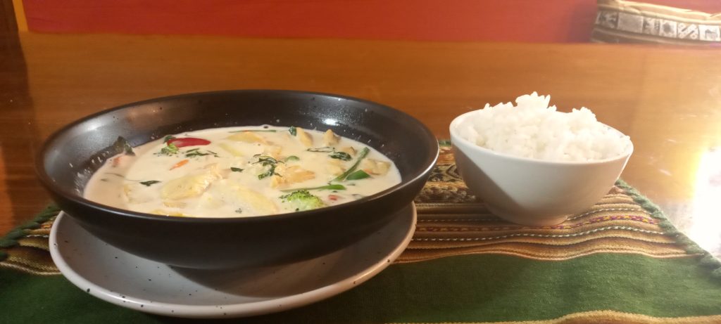 Curry rojo, verde o amarillo con verduras salteadas con leche de coco y arroz.