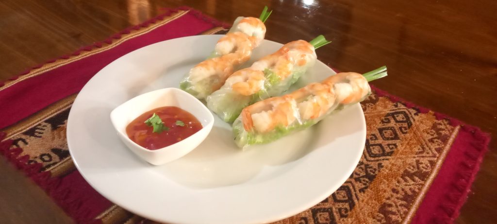 Spring Rolls con langostinos y salsa agridulce.